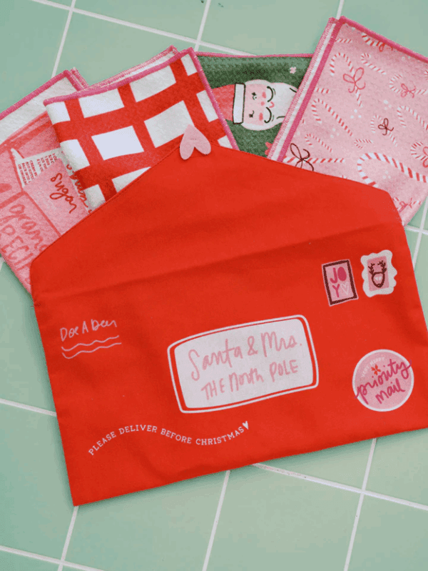Get your kitchen ready for holiday baking and festive messes with the Letters to Santa Waffle Cloths by Doe a Deer. This isn’t just a set of dishcloths; it’s a gift in itself!